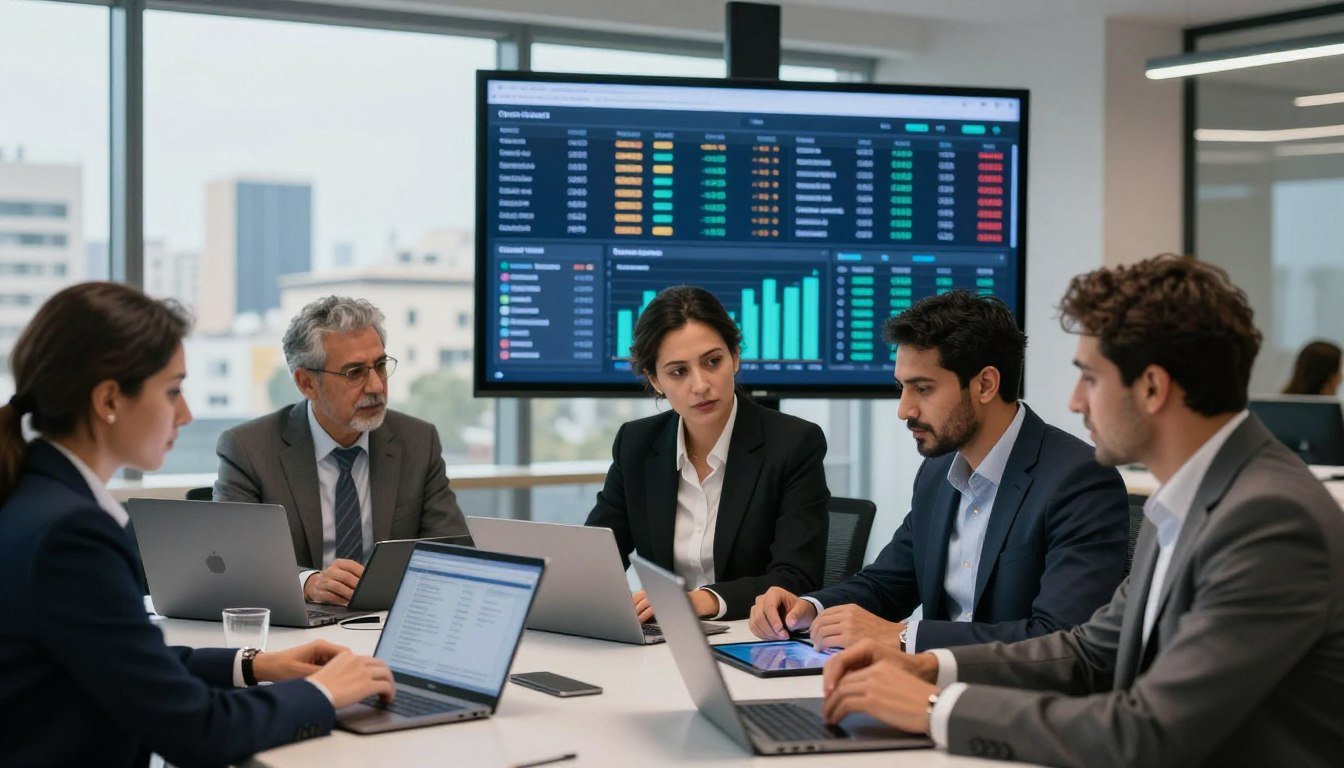 A modern banking environment depicting the concept of market liberalization in payment systems. In the foreground, a diverse group of professionals in business attire discuss financial strategies around a sleek table with laptops and digital devices displaying graphs and payment trends. The middle ground features an advanced digital screen showing a map of Morocco highlighting network connections and payment pathways. In the background, a bright, open office space with large windows exposes a bustling urban landscape, symbolizing growth and modernization. The lighting is bright and soft, creating a positive and forward-thinking atmosphere, shot from a slightly elevated angle to capture the expansive scene.