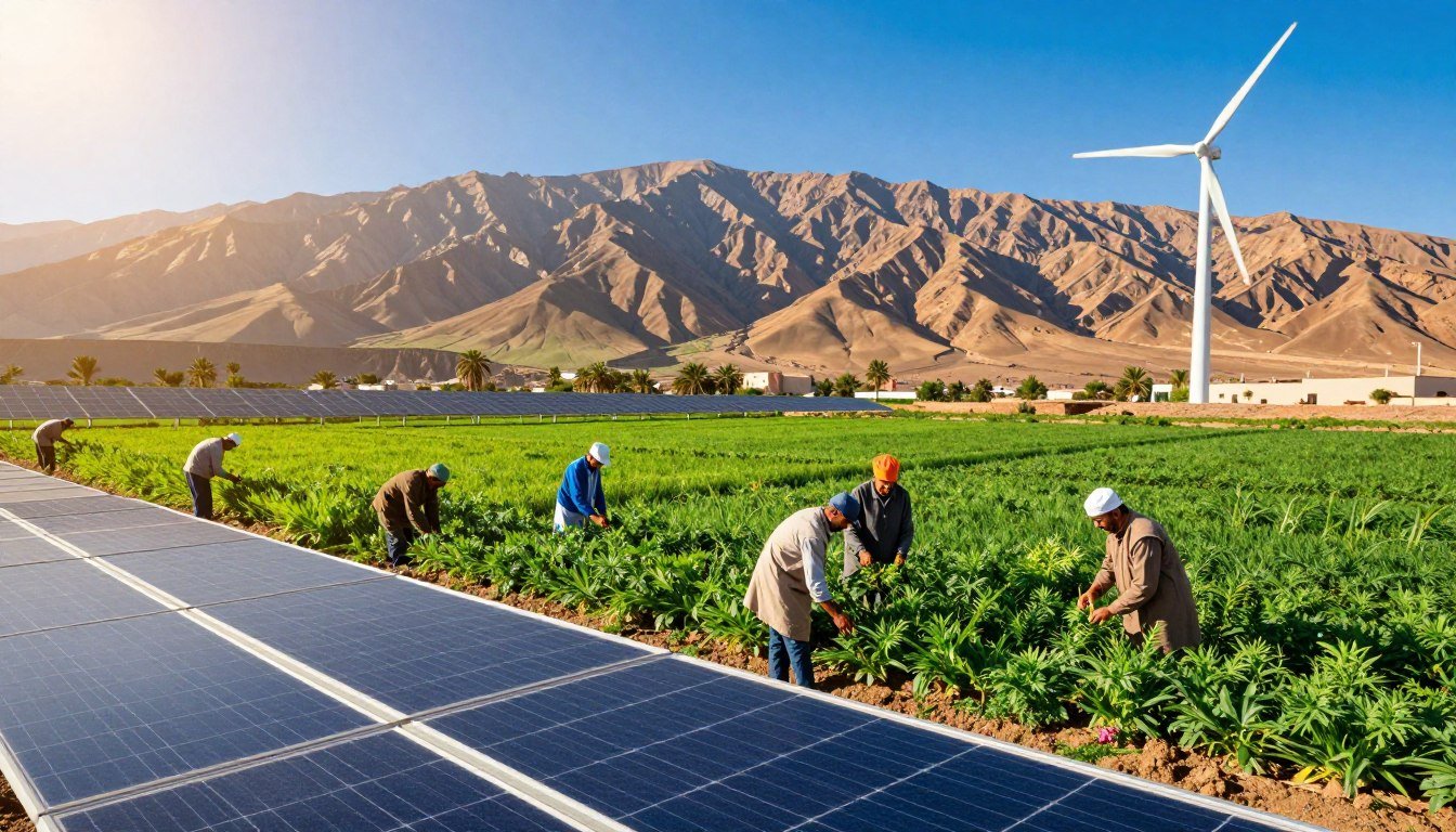 A vibrant and engaging landscape illustrating the ecological challenges faced by Morocco in its transition to a green economy. In the foreground, show diverse Moroccan landscapes, such as arid desert areas with windmills and solar panels, symbolizing renewable energy efforts. In the middle ground, depict local farmers combating drought, wearing professional attire and performing sustainable agricultural practices. The background should feature the Atlas Mountains under a clear blue sky, representing both the beauty of the region and the urgency for environmental protection. Use soft, natural lighting to create an optimistic yet contemplative mood. Capture the scene from a slightly elevated angle to encompass both the human activity and the vast, striking landscape.