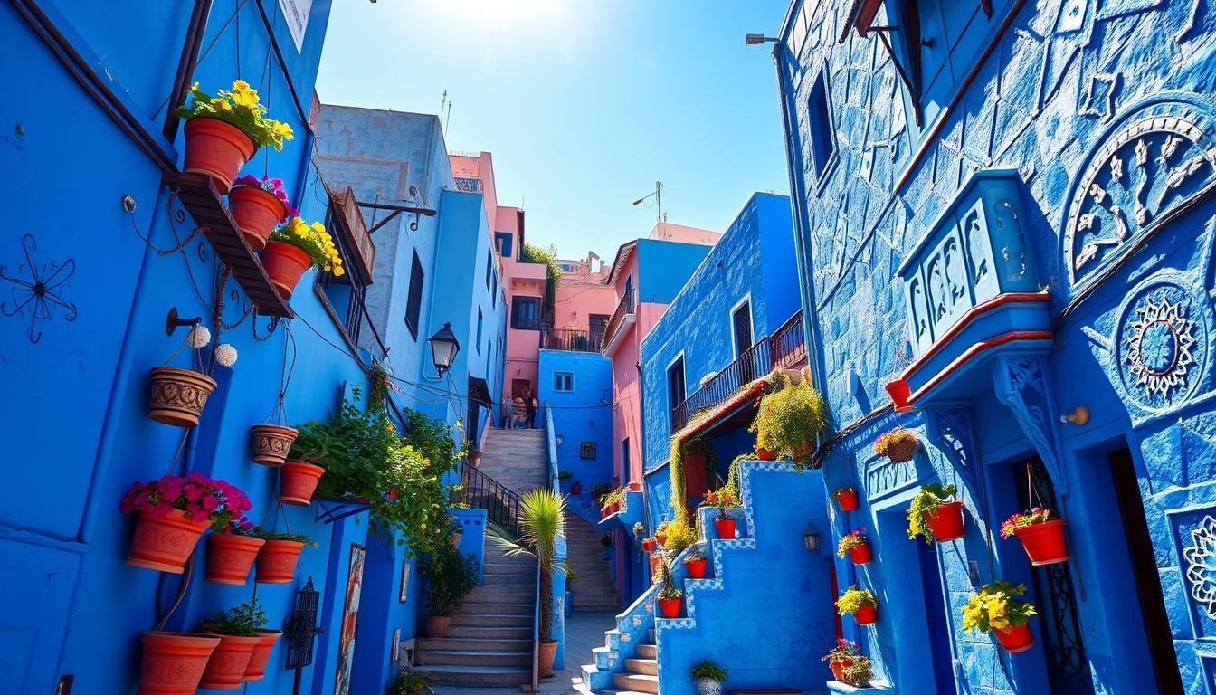 Chefchaouen’s blue buildings showcase Moroccan architecture’s charm. The city’s design mixes Andalusian and Moroccan styles. This creates a feast for the eyes for visitors.