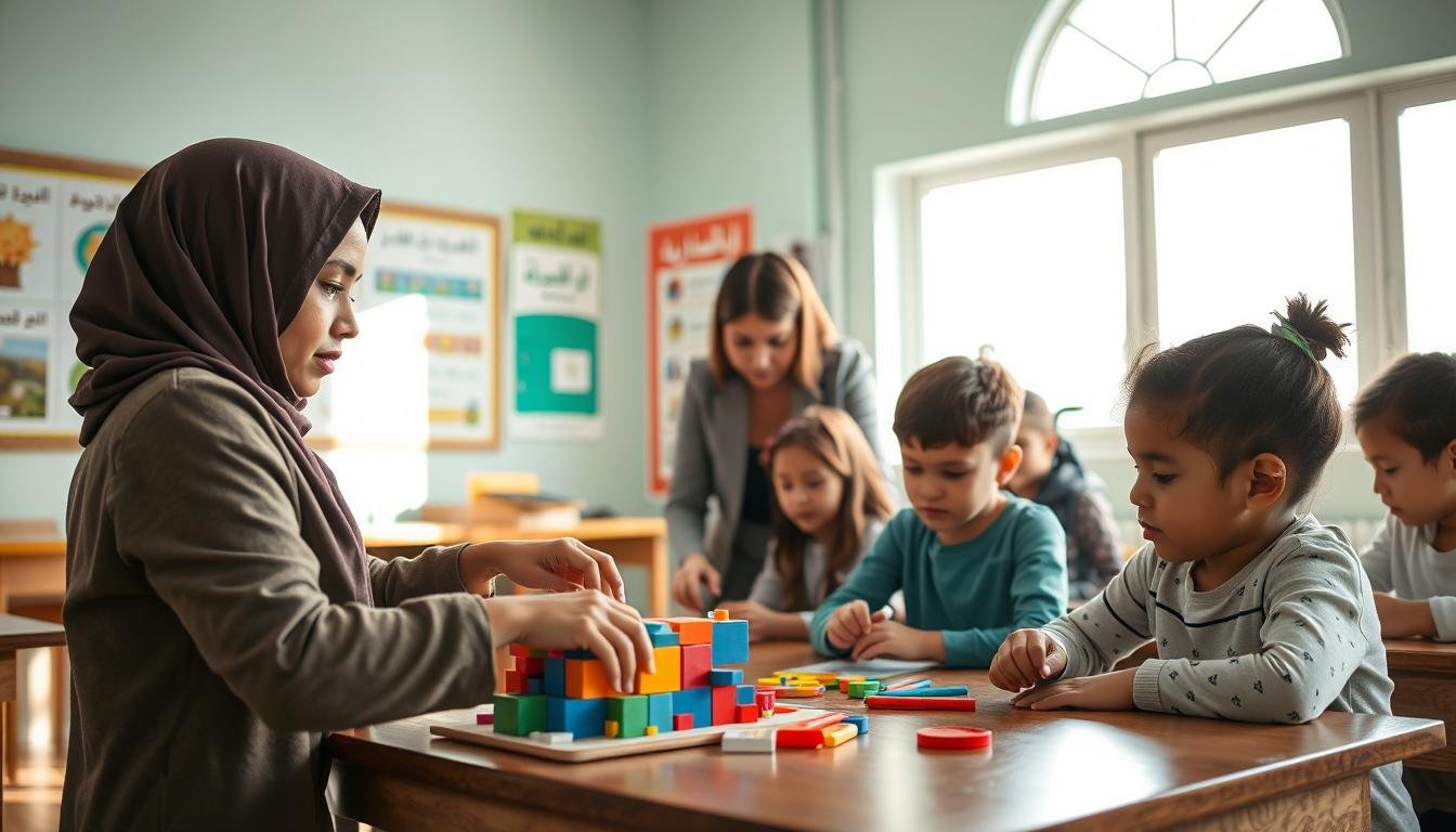 A vibrant preschool classroom in Morocco, showcasing children engaged in educational activities. In the foreground, a diverse group of children are playing with colorful building blocks and interacting with educational toys, all wearing modest casual clothing. In the middle, a teacher, dressed in professional attire, is guiding a small group as they work on a craft project. The background features a bright, sunny window with traditional Moroccan patterns, casting warm, natural light across the room, creating an inviting atmosphere. The walls are adorned with educational posters in Arabic and French, reflecting the cultural context. The overall mood is joyful and focused, highlighting the importance of early childhood education in Morocco.