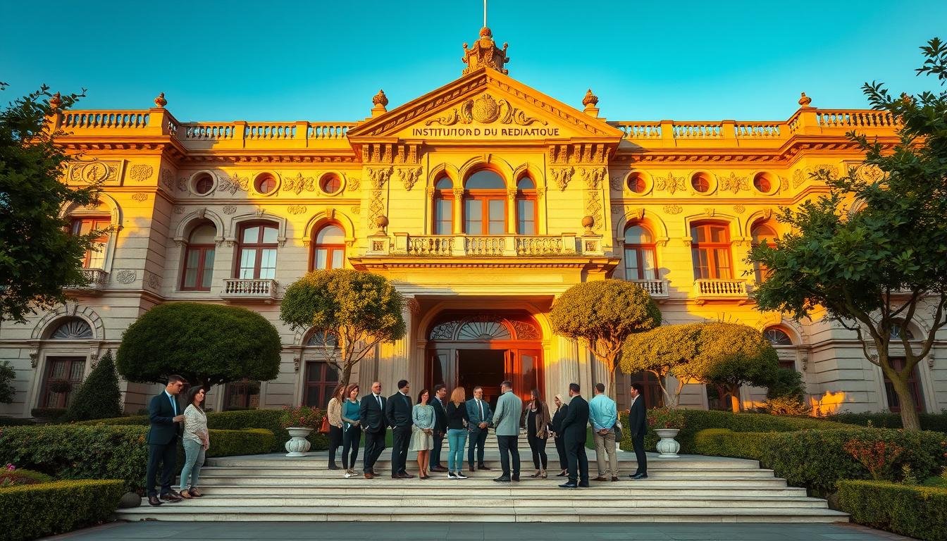 A historic scene depicting the evolution of the Mediator Institution, showcasing a grand, classical building in the foreground with elegant architectural details such as columns and large windows. In the middle ground, a diverse group of professional individuals in business attire engages in discussion, symbolizing collaboration and mediation. The background features lush gardens with well-kept trees and pathways, bathed in soft, warm sunlight that creates a serene and inviting atmosphere. The angle should be slightly elevated, providing a perspective that captures both the building's grandeur and the human interactions, evoking a sense of history, progress, and community. The overall mood is reflective and respectful, highlighting the institution's significance in society.