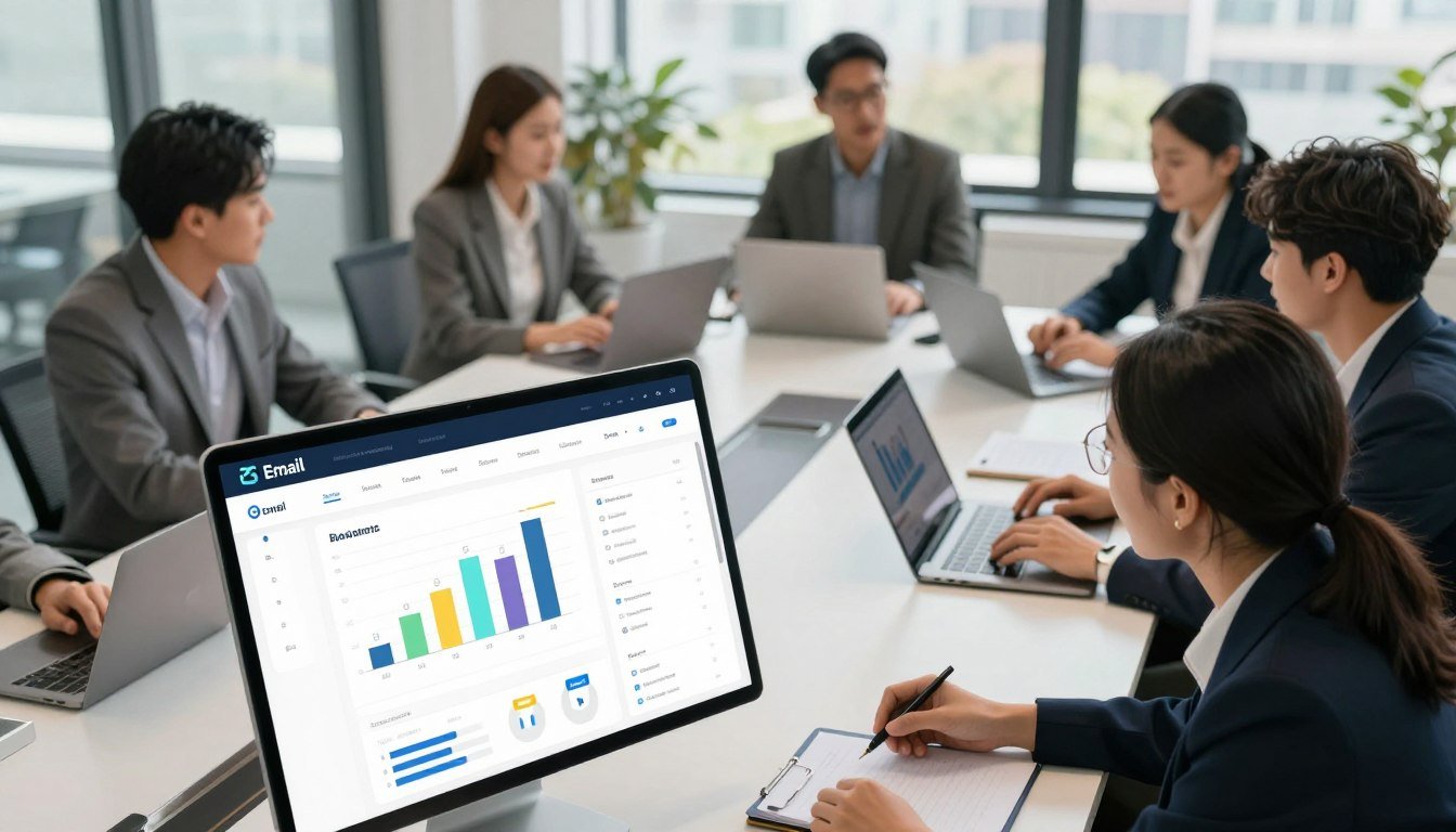 A professional office setting with a modern, sleek atmosphere. In the foreground, a diverse group of three professionals—two women and one man—are analyzing data on a large screen displaying colorful segmentation charts and email metrics. They are dressed in smart business attire, engaging in a collaborative discussion. The middle section features a stylish conference table with laptops, notes, and coffee cups, conveying a dynamic work environment. In the background, large windows allow soft, natural light to fill the room, creating a bright and inspiring mood. The overall atmosphere is one of teamwork and strategy, highlighting the importance of segmentation and personalization in email marketing to boost engagement.