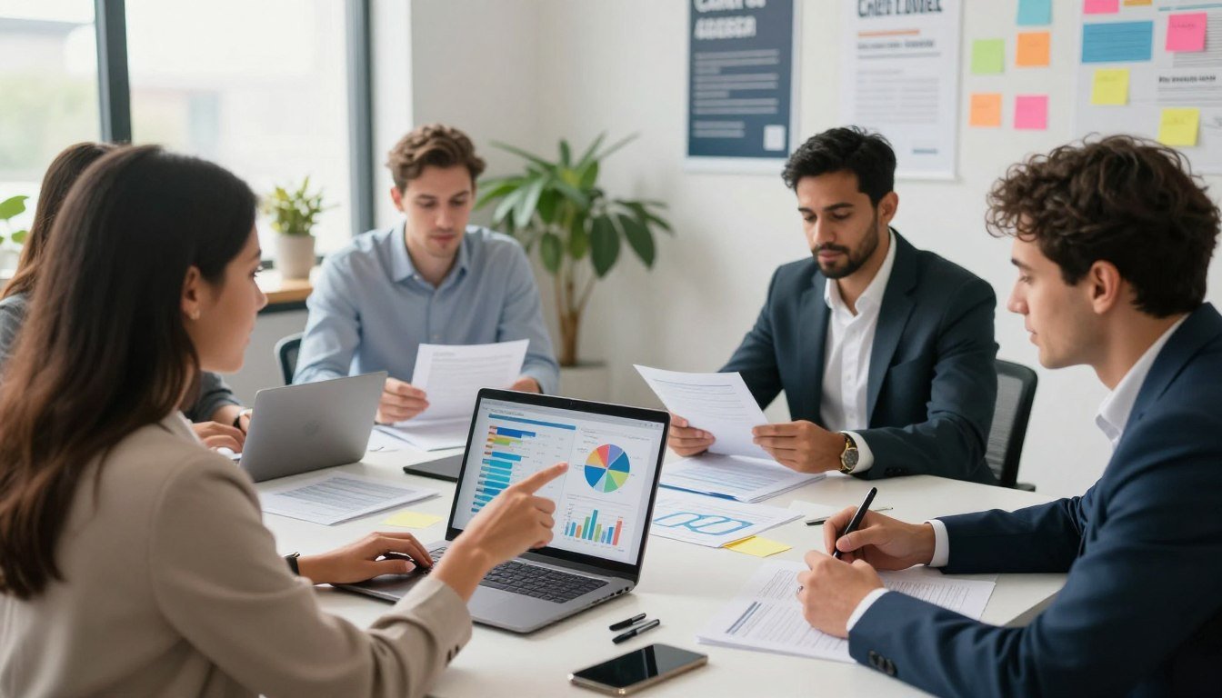 A professional office setting featuring a diverse group of individuals engaged in a self-assessment session. In the foreground, a man in a sharp suit is thoughtfully analyzing his strengths and values on a notepad, while a woman in business attire writes on a whiteboard filled with charts and goals. The middle ground shows a cozy conference table with laptops and coffee cups, emphasizing collaboration. The background has large windows letting in soft, natural light, giving a sense of openness and clarity. The mood is focused and motivational, reflecting determination and professional growth, with a clean, modern aesthetic.