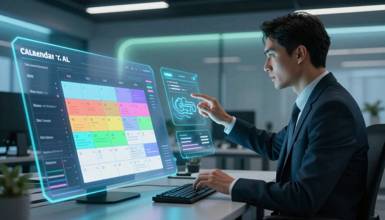 A futuristic office setting featuring a smart calendar interface, seamlessly integrated with digital devices. In the foreground, a sleek tablet displays a vibrant calendar filled with organized tasks and reminders. The middle ground showcases a professional individual, dressed in smart business attire, interacting with the calendar through touch gestures, highlighting the intelligent features. The background reveals a modern workspace with large windows, allowing natural light to flood in, enhancing the mood of productivity and innovation. Soft shadows are cast by contemporary furniture, creating a warm and inviting atmosphere. The scene is captured from a slight angle, emphasizing both the digital interaction and the elegant office design, evoking a sense of advanced technology working collaboratively with humans.