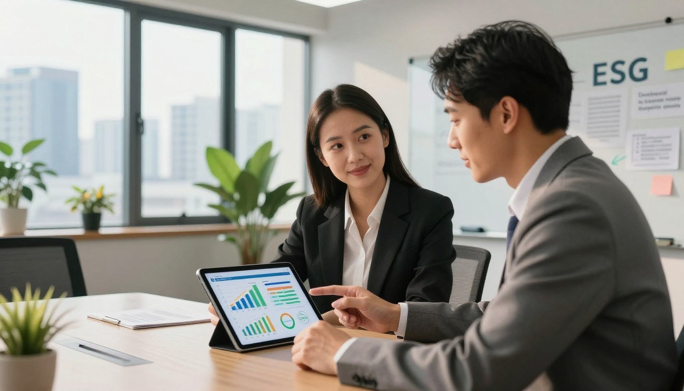 A professional office setting showcasing a diverse group of business professionals, including men and women of various ethnic backgrounds, gathered around a large conference table, engaged in a discussion about ESG (Environmental, Social, and Governance) reporting frameworks. The foreground features detailed documents with graphs and charts illustrating sustainability metrics. In the middle ground, a whiteboard displays key ESG principles and standards, with a focus on collaboration and strategy development. The background includes glass walls that offer a view of a green cityscape, symbolizing sustainability and innovation. Soft, natural lighting streams in through large windows, creating a bright and inspiring atmosphere that emphasizes professionalism and teamwork. The image should convey a sense of urgency and importance regarding ESG compliance and reporting practices.